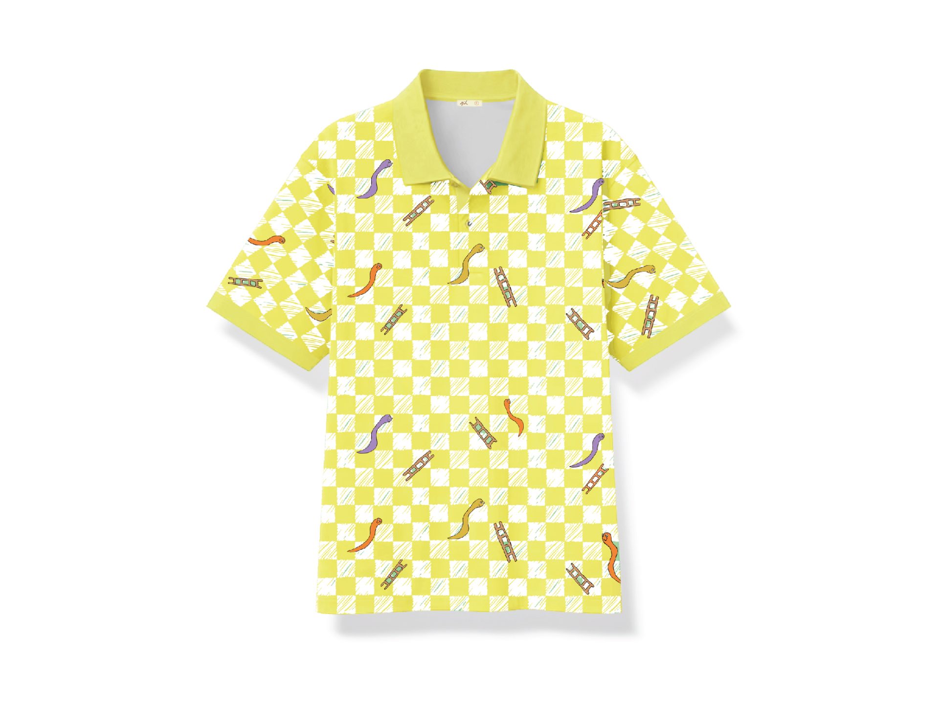 เสื้อโปโลพิมพ์ลาย สีเหลืองราชพฤกษ์ พิมพ์ลายภาพฝีพระหัตถ์ปีมะเส็ง “งูขึ้นกระได:ชีวิตก้าวหน้าขึ้นเรื่อยๆ”
