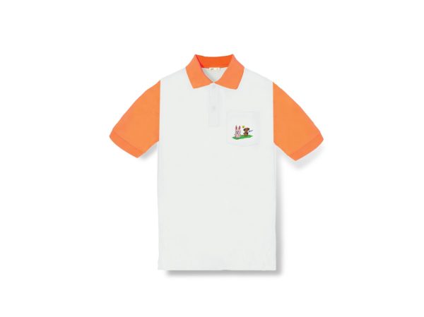 เสื้อโปโลสีขาว แขนสีส้ม กระต่ายมณีจันทร์ ปักภาพฝีพระหัตถ์ปีเถาะ บริเวณกระเป๋าด้านซ้าย เนื้อผ้า COTTON + LYCRA + POLYESTER