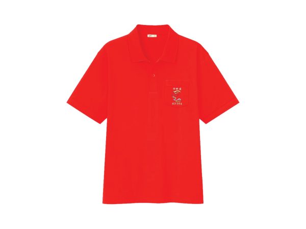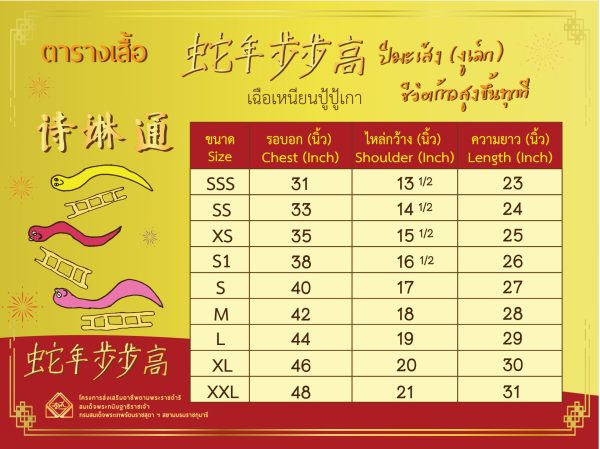 เสื้อโปโลสีแดง งูขึ้นกระได ปักภาพฝีพระหัตถ์ปีมะเส็งภาษาจีน บริเวณกระเป๋าด้านซ้าย เนื้อผ้า COTTON + LYCRA + POLYESTER โดยพรพระราชทานจาก สมเด็จพระกนิษฐาธิราชเจ้า กรมสมเด็จพระเทพรัตนราชสุดา ฯ สยามบรมราชกุมารี ว่า 蛇 年步步高 อ่านว่า เฉือเหนียนปู้ปู้เกา ความหมายพรพระราชทาน คือ ปีมะเส็ง (งูเล็ก) ชีวิตก้าวสูงขึ้นทุกที