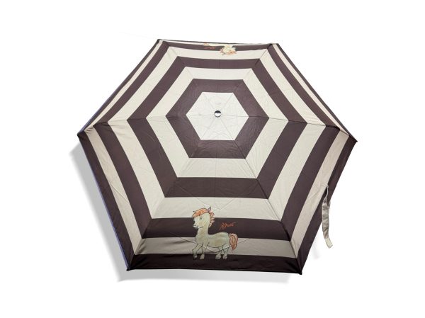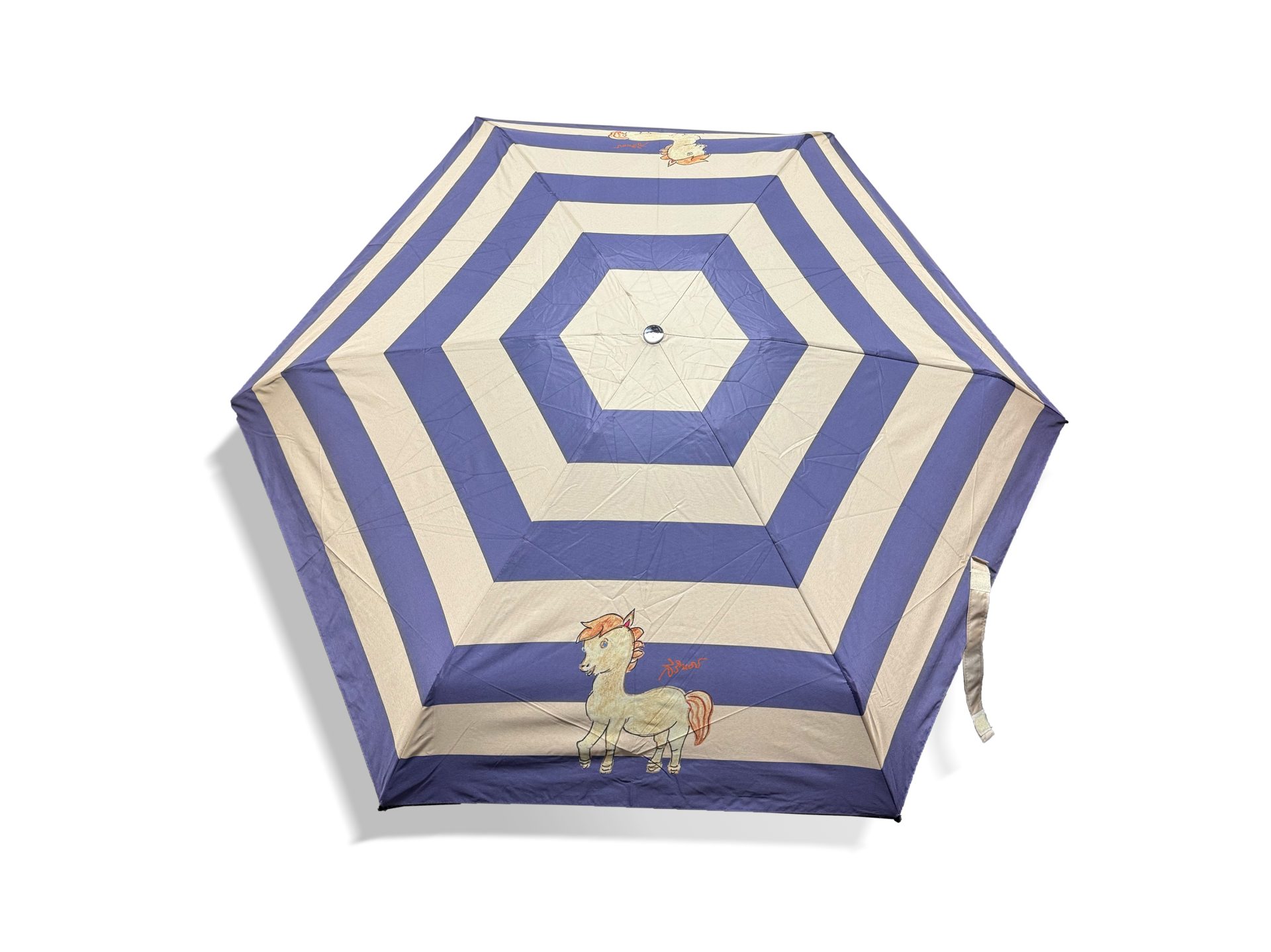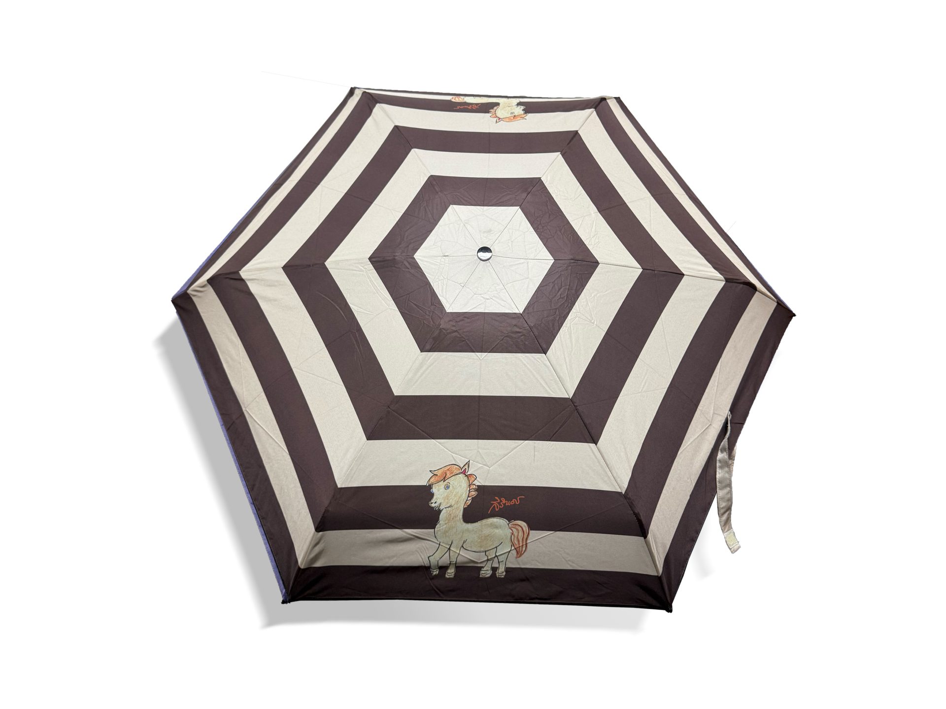 ร่มพับ 5 ตอน พิมพ์ลายภาพฝีพระหัตถ์ปีมะเมีย เล็กกะทัดรัด พกพาสะดวก ขนาดกว้าง 98 ซม. เมื่อกางออก และขนาดยาว 18 ซม. เส้นรอบผ่านศูนย์กลาง 5.5 ซม. เมื่อพับเก็บ