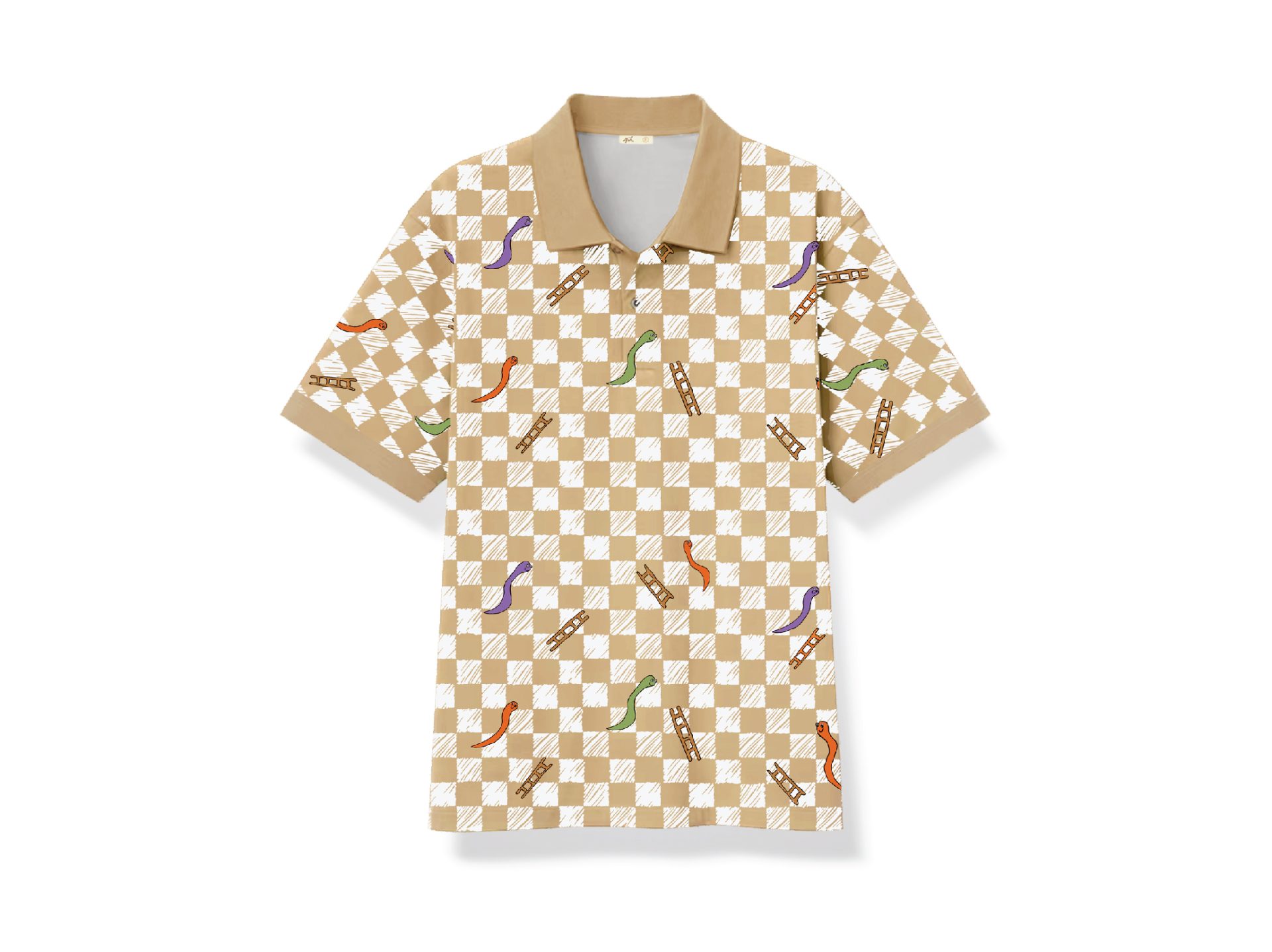 เสื้อโปโลพิมพ์ลาย สีน้ำตาลพิกุล พิมพ์ลายภาพฝีพระหัตถ์ปีมะเส็ง “งูขึ้นกระได:ชีวิตก้าวหน้าขึ้นเรื่อยๆ”