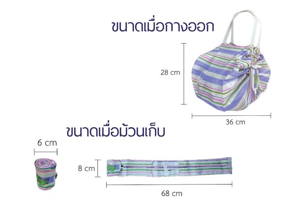 ตัวกระเป๋าเมื่อกางออก ขนาดกว้าง 36 cm. สูง 28 ซม.(ไม่รวมความยาวหู) ขนาดเก็บแล้ว 6 x8 ซม. มีทั้งหมด 4 สี