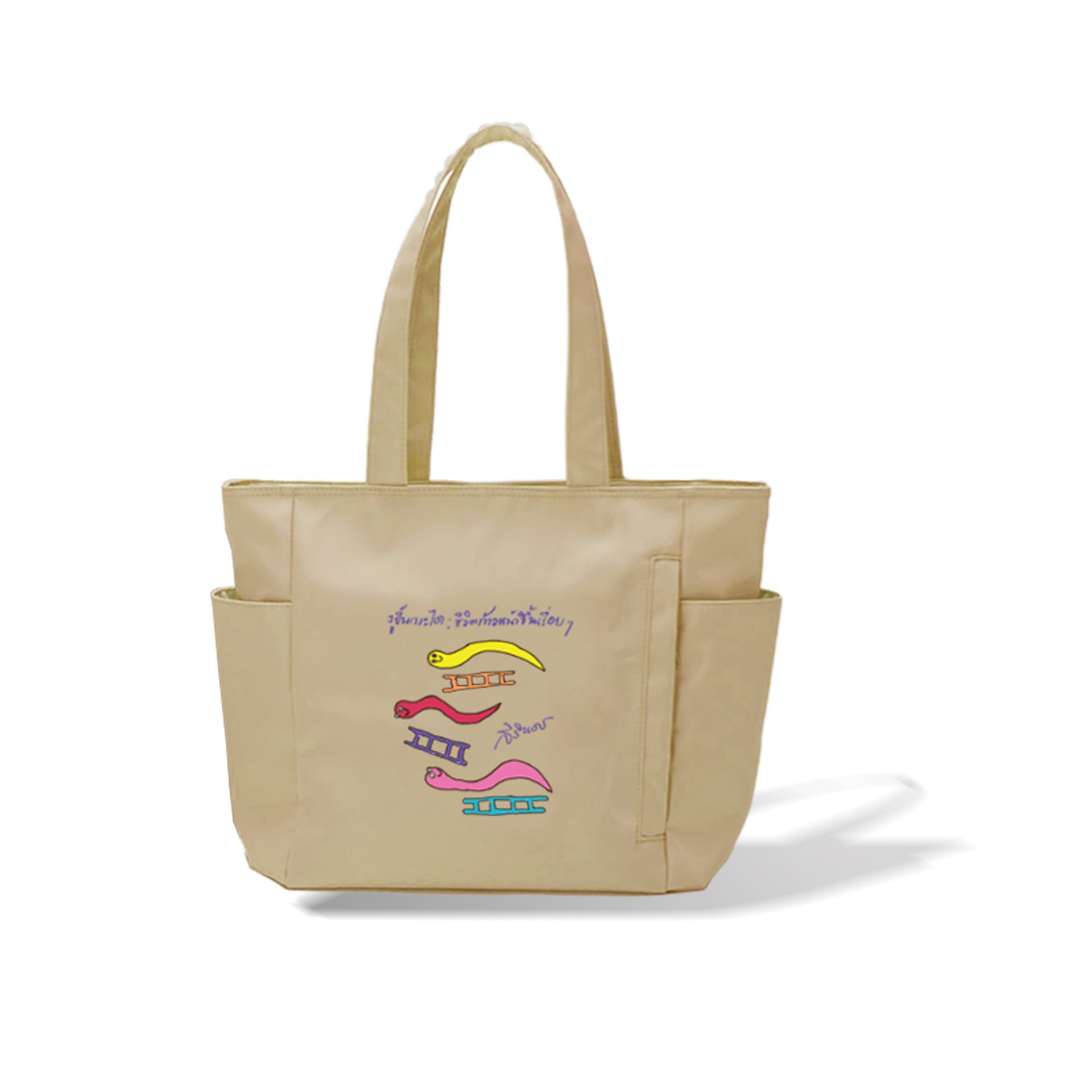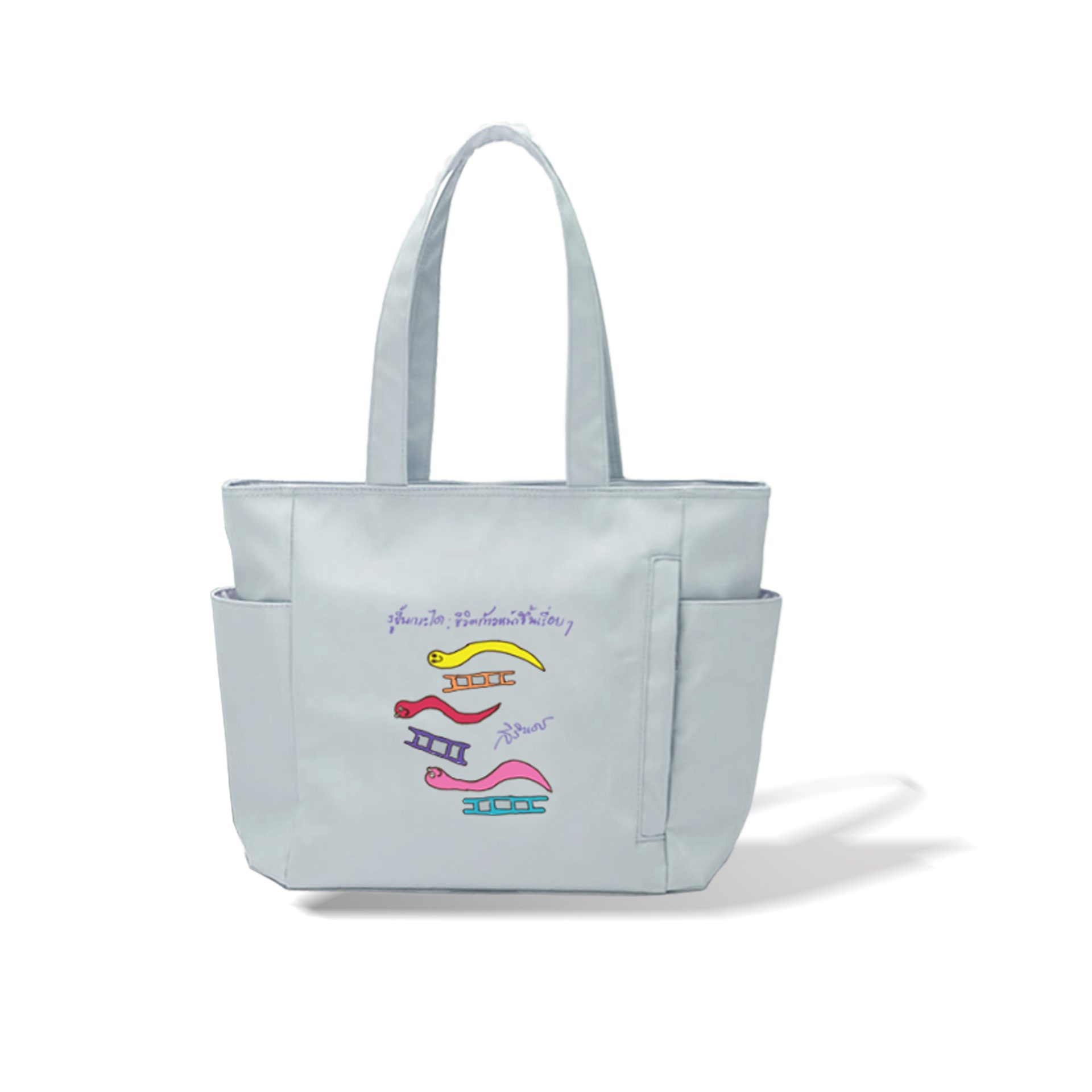 กระเป๋า Tote Bag ใหญ่ พิมพ์ลายภาพฝีพระหัตถ์ปีมะเส็ง ผ้าเนื้อไนล่อน ให้สัมผัสที่นุ่มลื่น น้ำหนักเบา ขนาดกว้าง 28 ซม. สูง 29 ซม. ก้นกระเป๋า 15 ซม.