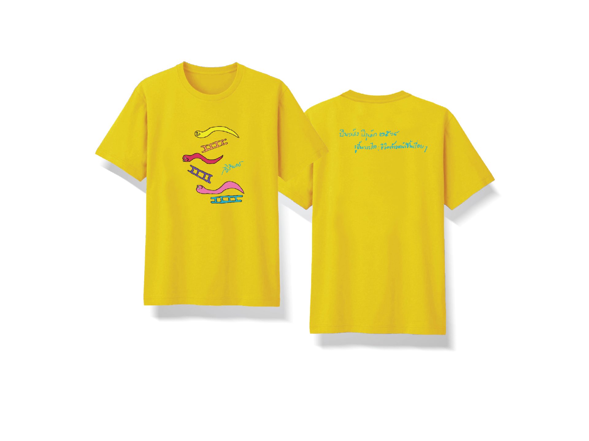 เสื้อทีเชิ้ต สีเหลืองประดู่ พิมพ์ลายภาพฝีพระหัตถ์ปีมะเส็ง “งูขึ้นกระได:ชีวิตก้าวหน้าขึ้นเรื่อยๆ”