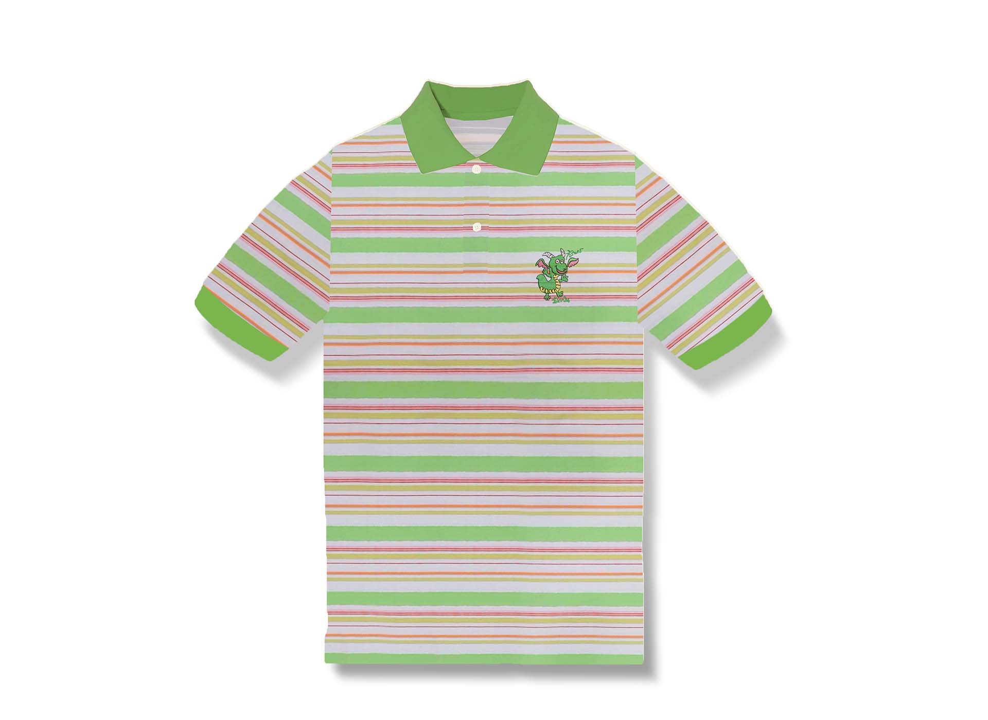 เสื้อโปโลลายริ้วเขียว มังกรร่ำรวย ปักภาพฝีพระหัตถ์ปีมะโรง บริเวณอกด้านซ้ายไม่มีกระเป๋าเสื้อ เนื้อผ้า COTTON + LYCRA + POLYESTER