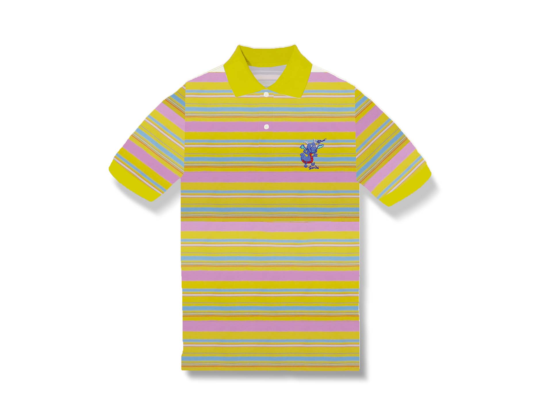 เสื้อโปโลลายริ้วเหลือง มังกรสุขล้ำ ปักภาพฝีพระหัตถ์ปีมะโรง บริเวณอกด้านซ้ายไม่มีกระเป๋าเสื้อ เนื้อผ้า COTTON + LYCRA + POLYESTER