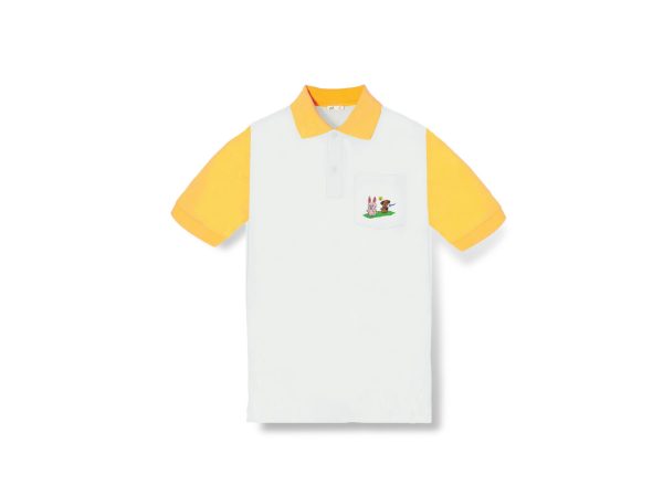 เสื้อโปโลสีขาว แขนสีเหลือง กระต่ายนวลจันทร์ ปักภาพฝีพระหัตถ์ปีเถาะ บริเวณกระเป๋าด้านซ้าย เนื้อผ้า COTTON + LYCRA + POLYESTER