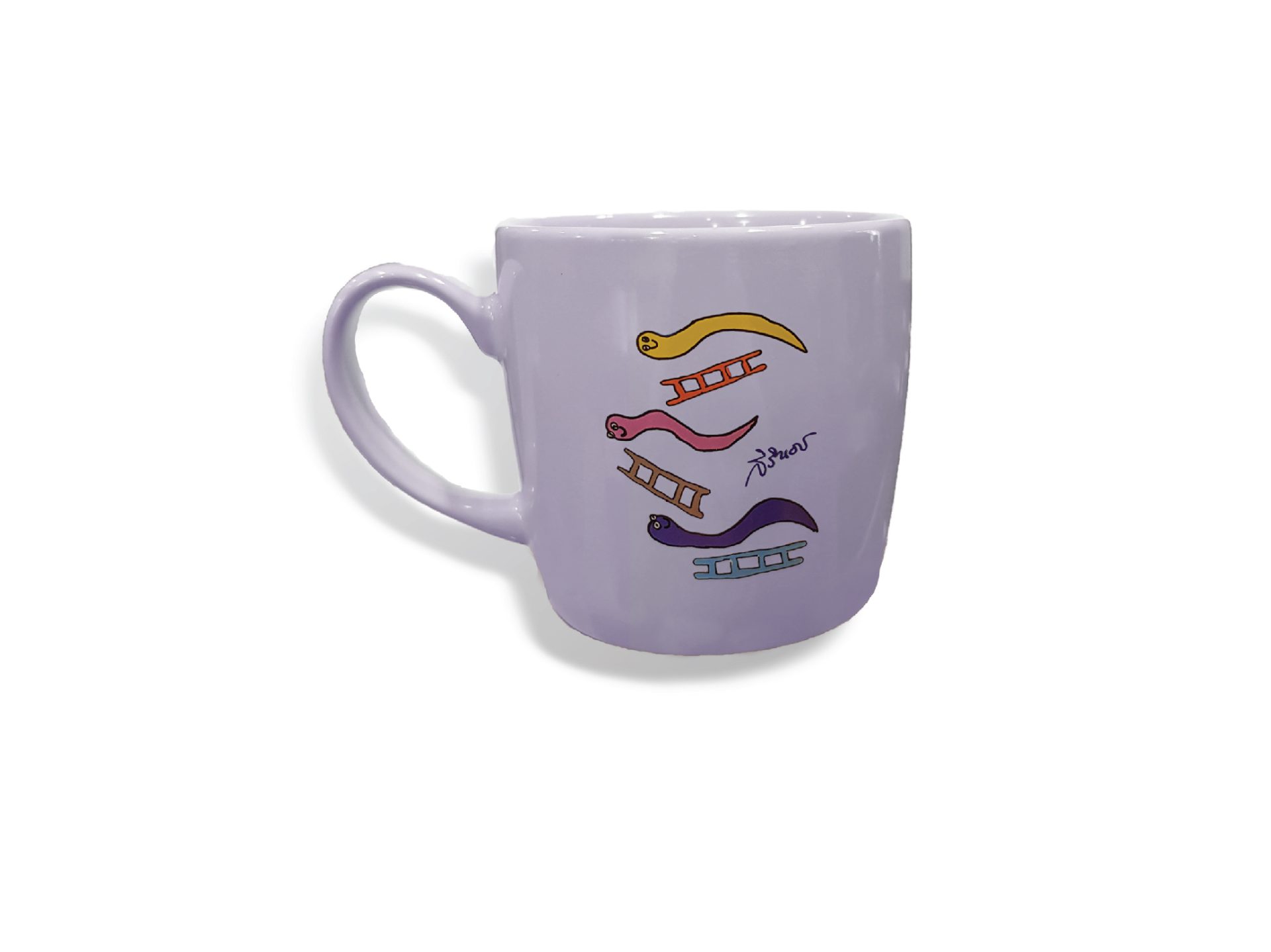 แก้วเมัคพิมพ์ลายภาพฝีพระหัตถ์ปีมะเส็ง ขนาดปากแก้ว กว้าง 8.5 ซม. สูง 9.5 ซม. – สีม่วง – สีน้ำตาล