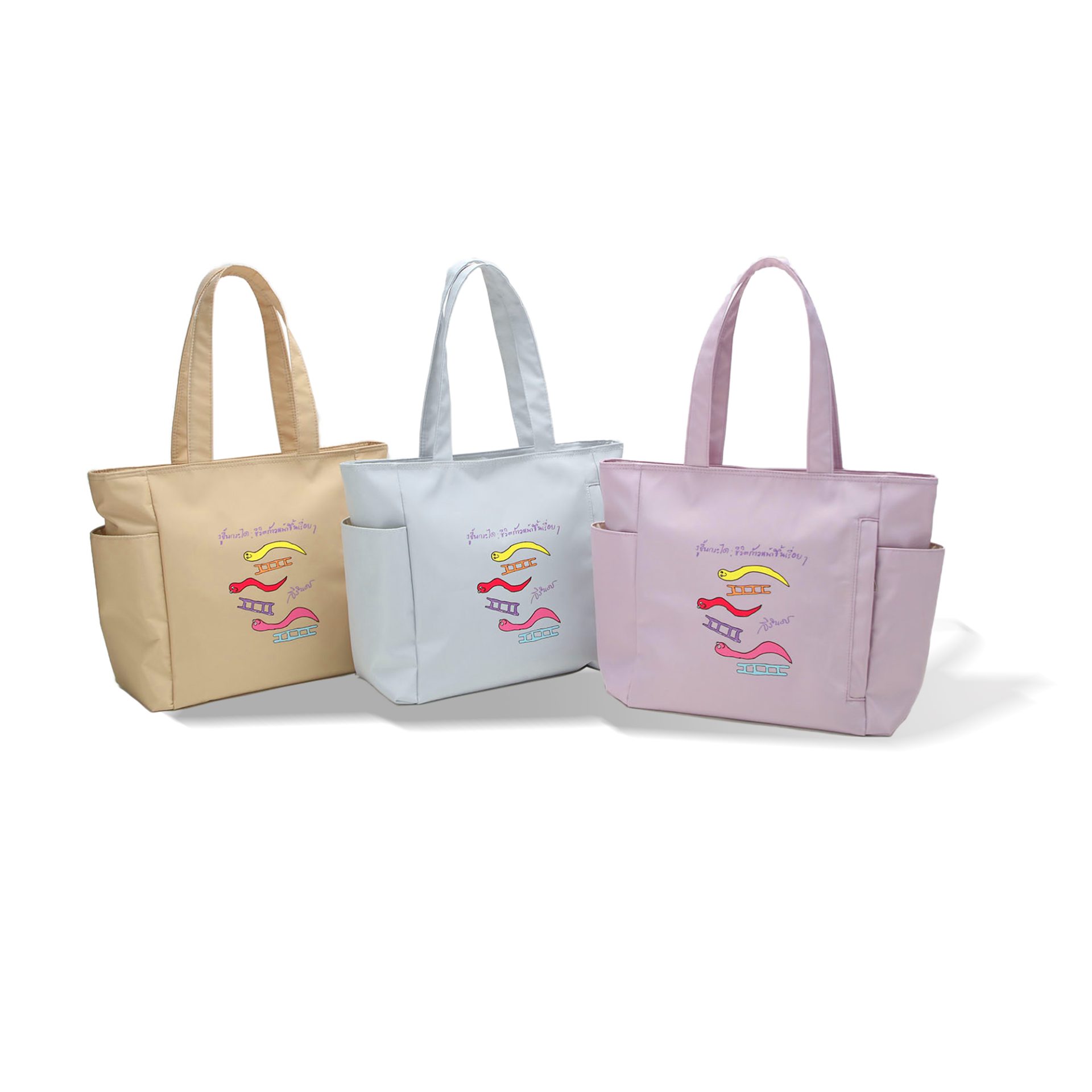กระเป๋า Tote Bag ใหญ่ พิมพ์ลายภาพฝีพระหัตถ์ปีมะเส็ง ผ้าเนื้อไนล่อน ให้สัมผัสที่นุ่มลื่น น้ำหนักเบา ขนาดกว้าง 28 ซม. สูง 29 ซม. ก้นกระเป๋า 15 ซม.