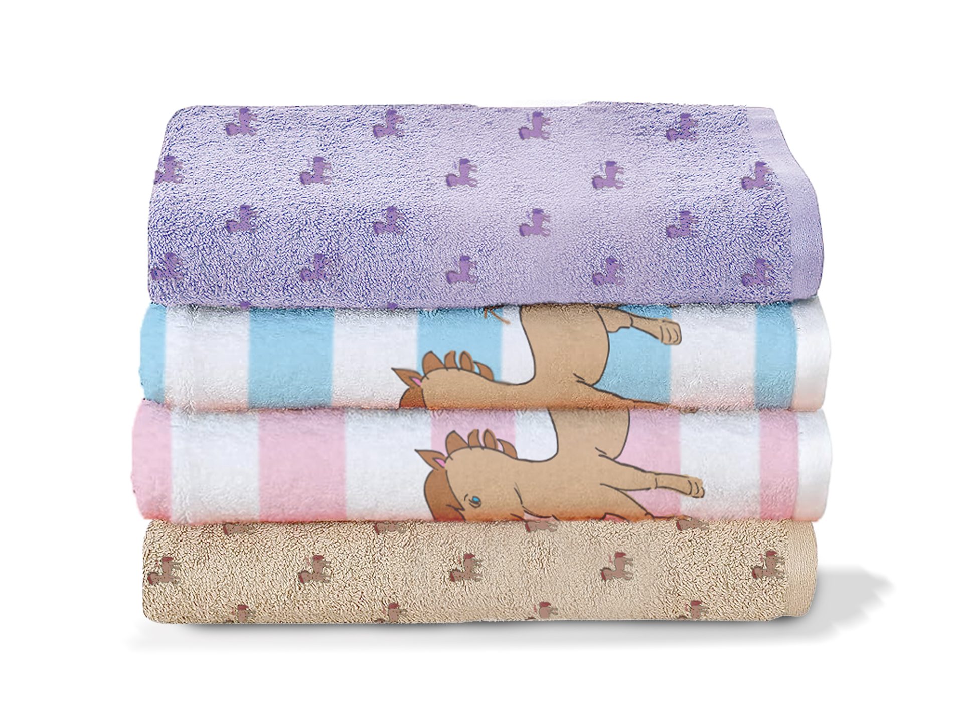 ผ้าขนหนูพิมพ์ลายภาพฝีพระหัตถ์ปีมะเมีย เนื้อผ้านุ่ม ดูดซับน้ำดีเยี่ยม มี 4 สี สีม่วง สีน้ำตาล สีฟ้า สีชมพู
