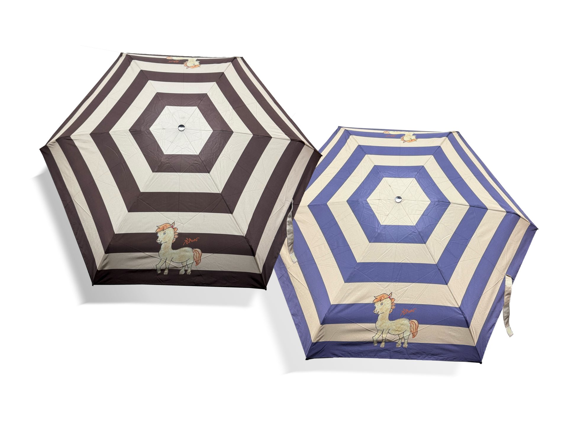 ร่มพับ 5 ตอน พิมพ์ลายภาพฝีพระหัตถ์ปีมะเมีย เล็กกะทัดรัด พกพาสะดวก ขนาดกว้าง 98 ซม. เมื่อกางออก และขนาดยาว 18 ซม. เส้นรอบผ่านศูนย์กลาง 5.5 ซม. เมื่อพับเก็บ