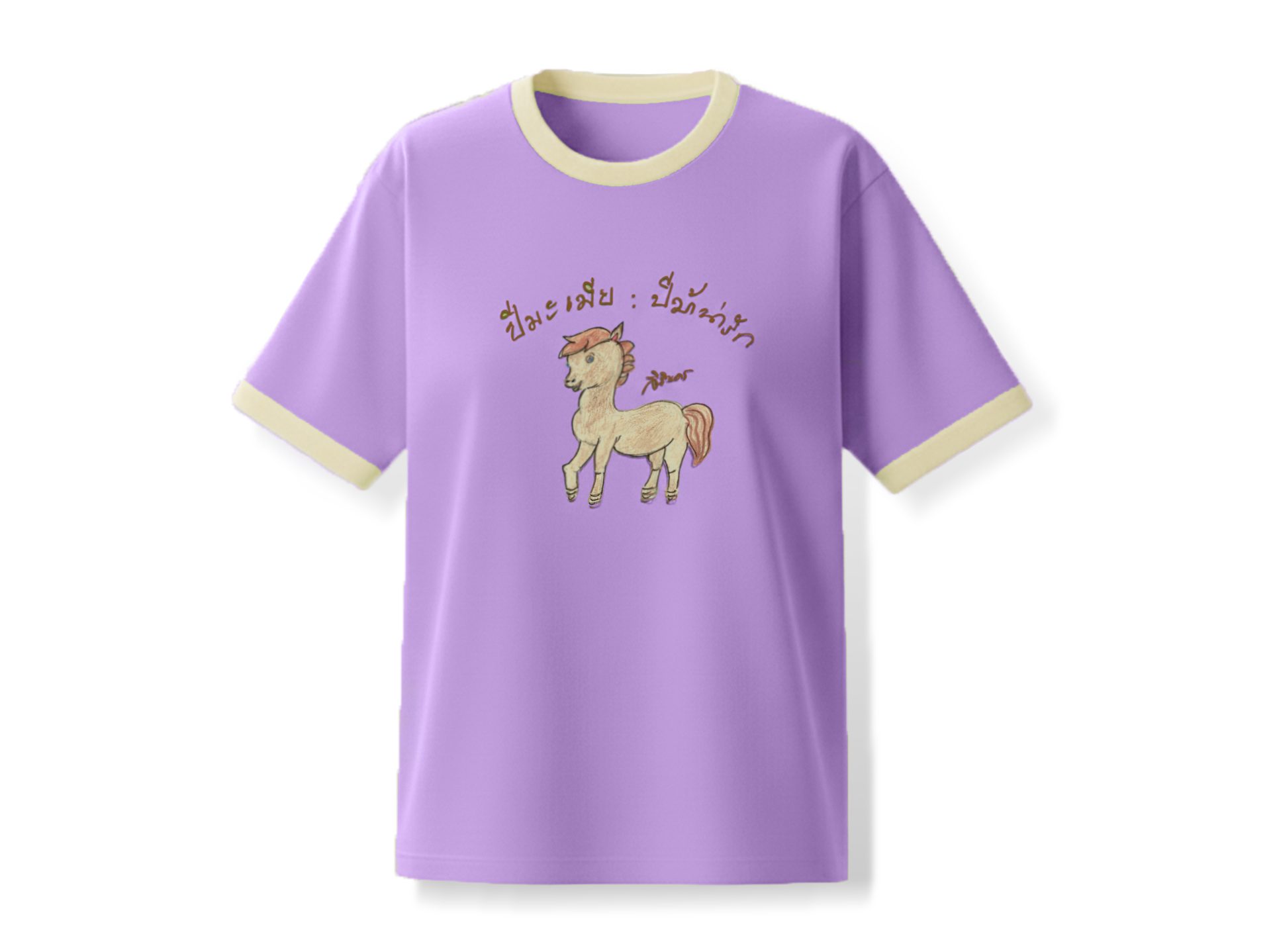 เสื้อทีเชิ้ต สีม่วงชื่นใจ พิมพ์ลายภาพฝีพระหัตถ์ปีมะเมีย “ปีมะเมีย ปีม้าน่ารัก”
