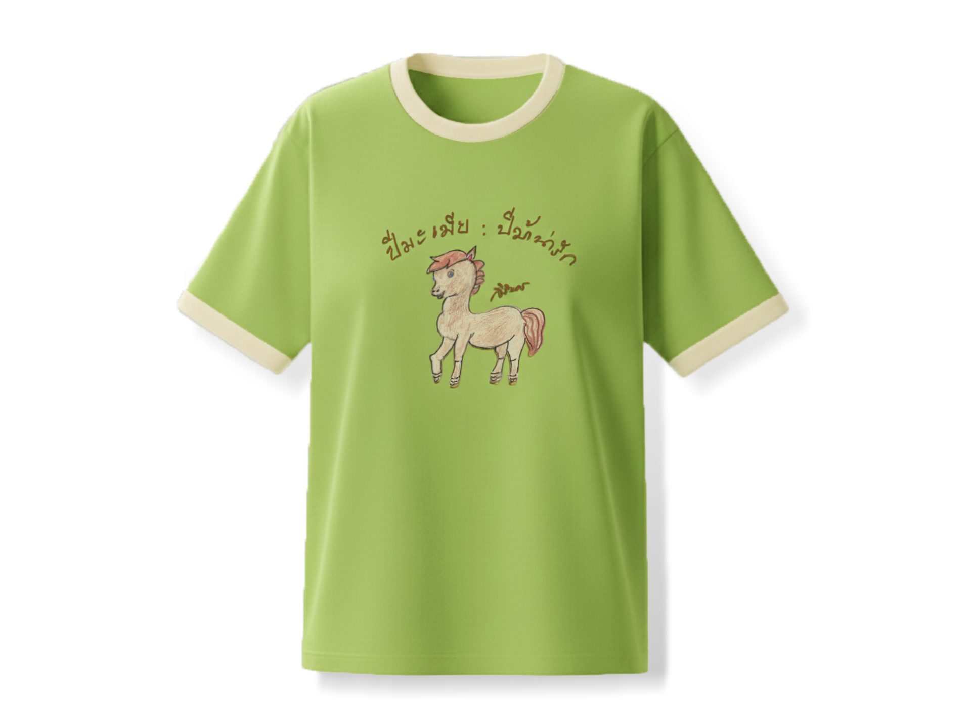เสื้อทีเชิ้ต สีเขียวร่มรื่น พิมพ์ลายภาพฝีพระหัตถ์ปีมะเมีย “ปีมะเมีย ปีม้าน่ารัก”